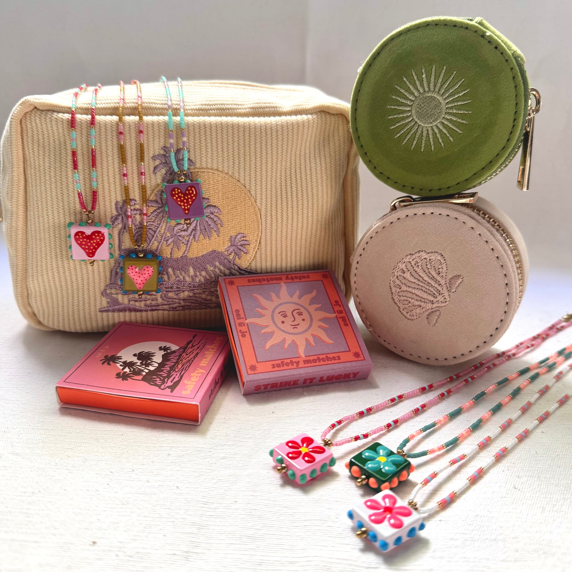 El interior está pensado para proteger tus piezas: suave, acolchado y con un pequeño compartimento para anillos, pendientes o collares. Su tamaño compacto lo hace ideal para llevar en el bolso, en la maleta o simplemente para organizar tus esenciales en casa.