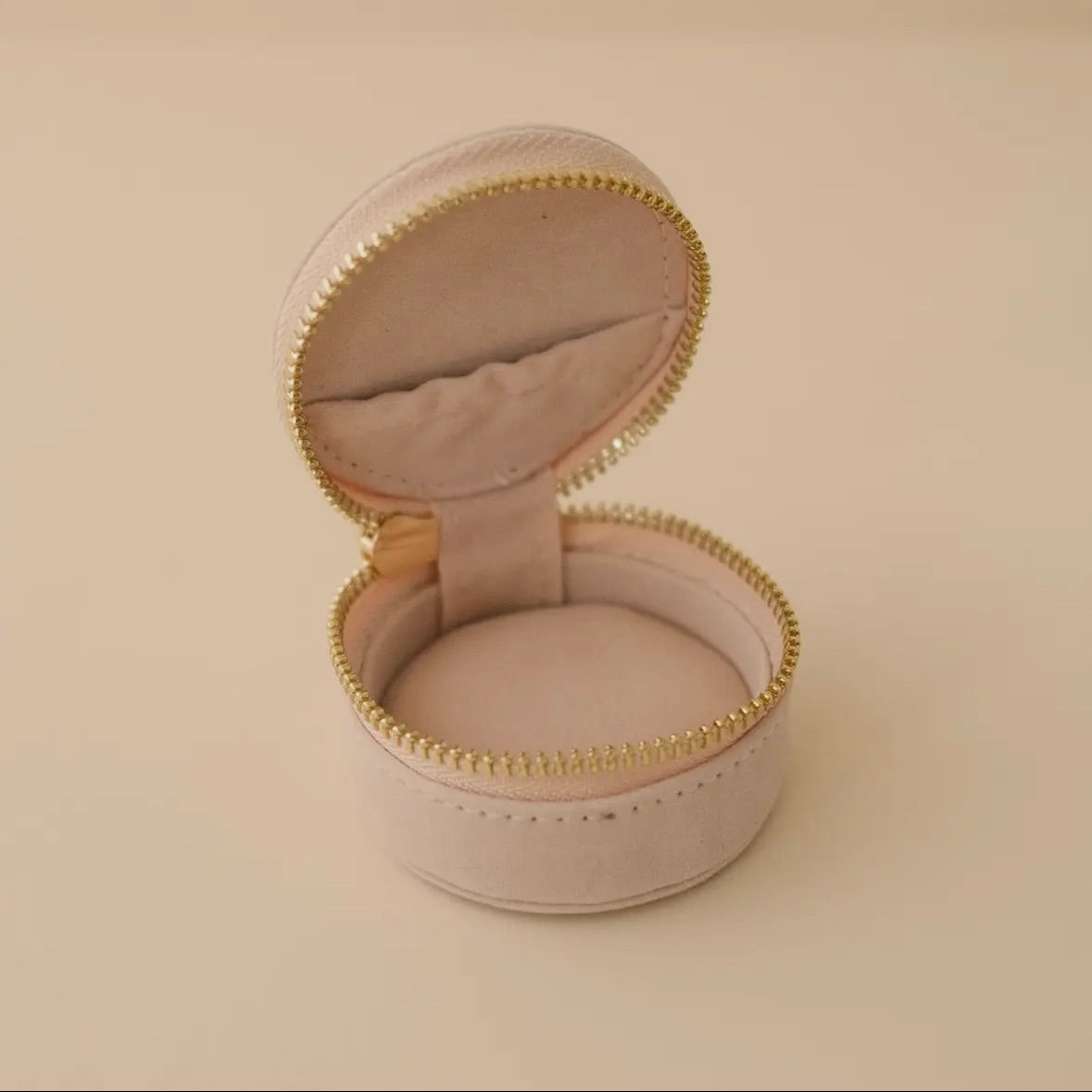Este mini joyero redondo es el complemento perfecto para quienes aman cuidar sus joyitas con mimo. Su diseño en beige suave, la textura aterciopelada y el delicado bordado en la tapa lo convierten en una pieza tan bonita como práctica.