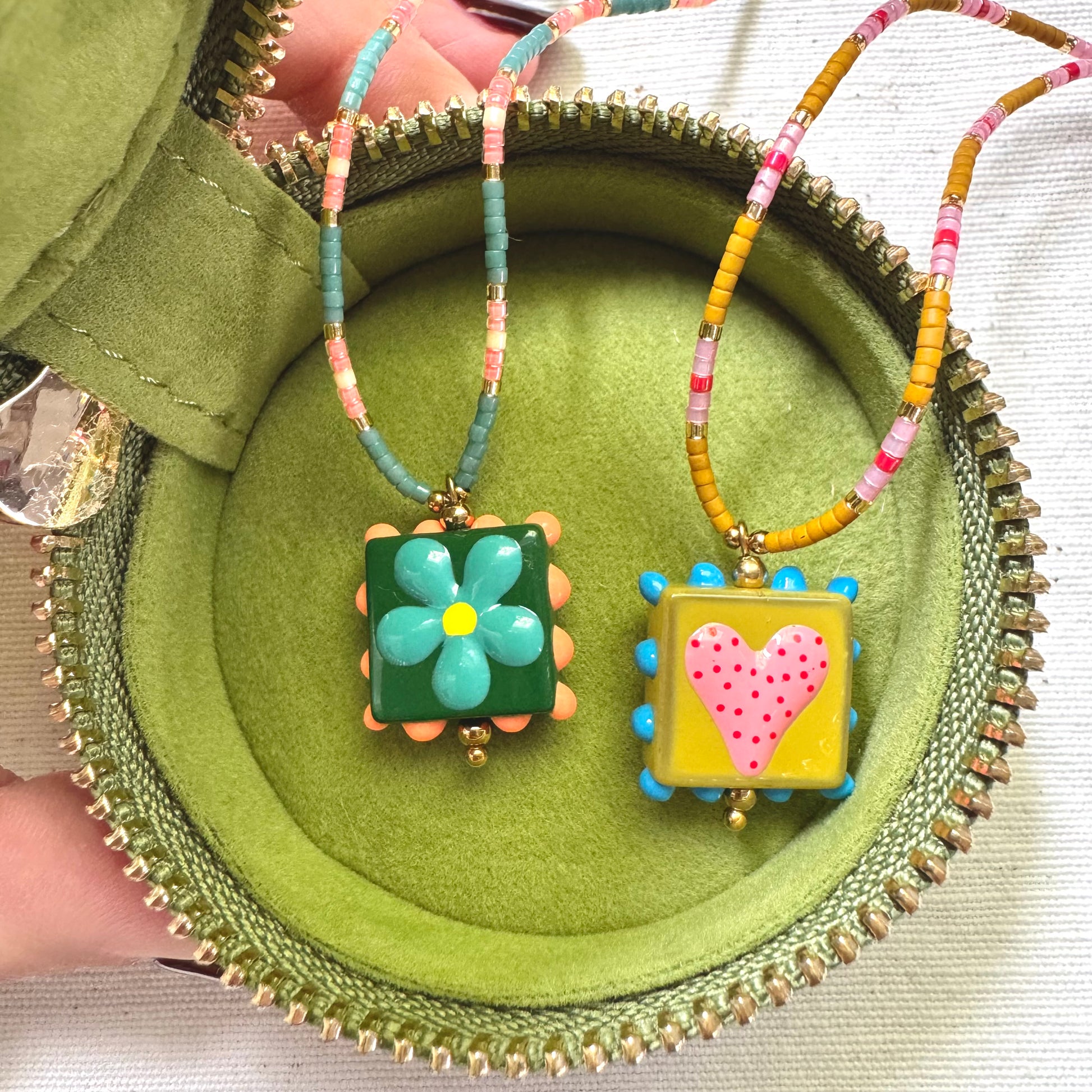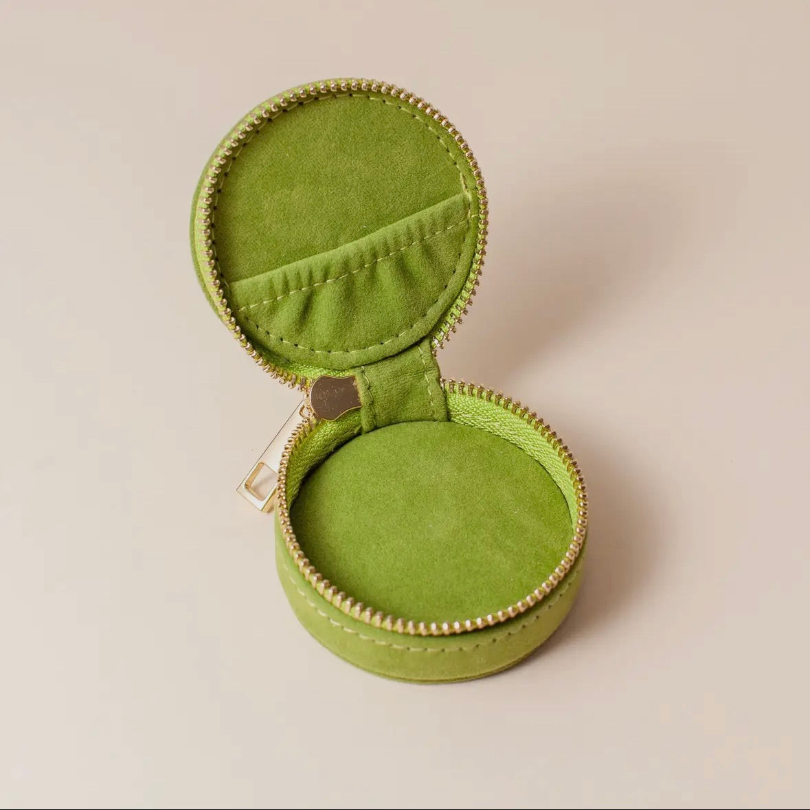 Este mini joyero redondo es el complemento perfecto para quienes aman cuidar sus joyitas con mimo. Su diseño en verde oliva, la textura aterciopelada y el delicado bordado en la tapa lo convierten en una pieza tan bonita como práctica.